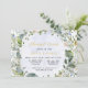 J'espère que vous apprécierez cette couronne de verdure avec des fleurs sauvages dans une texture d'aquarelle bleu poussiéreuse avec écriture calligraphie dorée. Les produits correspondants et les invitations sont disponibles dans cette collection.