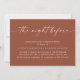 Insufflez votre fête mariage de automne avec chaleur et caractère en utilisant cette invitation à dîner de répétition en terre cuite. L'arrière - plan en terre cuite terrestre donne un ton romantique et délimité, tandis que l'élégant manuscrit "la veille" ajoute une touche personnelle et intime. Inspiré par les tons naturels d'argile rouille, les fleurs séchées et les soirées automnales aux chandelles, ce design est parfait pour les mariages de automne d'inspiration boho, rustique ou désertique. Que ce soit dans un vignoble, un jardin, une grange ou une boutique, cette invitation apporte charme et cohésion à votre événement. Disponible en téléchargement numérique - imprimer à la maison ou avec votre service d'impression préféré.