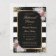 Élégant dîner de répétition rayé noir et blanc invitant avec des fleurs roses rousses encadrant les détails de l'événement à l'intérieur d'un cadre doré orné de confettis dorés. Éléments correspondants disponibles. Invitation à dîner de répétition florale. Dîner de répétition en noir et or.