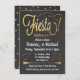 Super fun Mexican Fiesta Rehearsal dîner invitation avec des confettis et des polices de parties scintillant brillantes sur un arrière - plan de tableau noir. Illustration tirée à la main par McBooboos