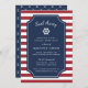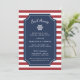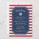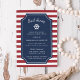 Les invitations à des dîners de répétition d'été sur le thème nautique en rouge, blanc et bleu présentent un arrière - plan rayé rouge et blanc avec vos informations d'événement en blanc sur un élément central bleu marine, accentué par l'illustration de la roue d'un navire. Idéal pour des dîners de répétition sur yachts, voiliers ou dîners-croisière à la marina, club nautique ou lieux thématiques nautiques. Les invitations s'inversent à un motif de minuscules ancres blanches sur le bleu marine correspondant.