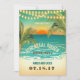 Des palmiers et des lampes à cordes encadrent le coucher de soleil de l'océan et le rivage sablonneux de cette belle plage de mariage Répétition Diner Invitation Customisez le texte moderne et élégant à l'avant et à l'arrière avec vos informations.