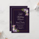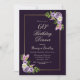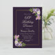 Un dîner d'anniversaire fleuri violet, lavande et rose 60e invitation avec plumes roses et violettes et feuilles délicats de fougères vertes.