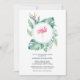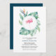 Les invitations élégantes et actuelles de dîner de répétition comportent mon flamant original de rose d'aquarelle entouré par la verdure botanique luxuriante et un oiseau de fleur de paradis. Customisez avec vos détails de partie ou de dîner alignés au fond dans le lettrage moderne. Les invitations s'inversent au bleu marine solide. Pour voir plus de conceptions aimez ceci, visite www.zazzle.com/vginvites