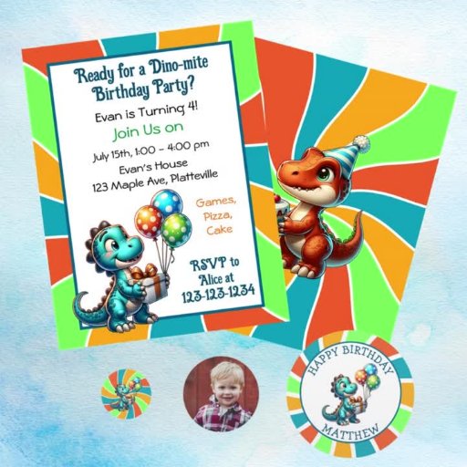 Adorable Personnalisé Boy's Birthday Party invitations. Cute thème dinosaure en bleu, orange et vert. De mignons dinosaures caricaturaux tenant des ballons et un gâteau d'anniversaire.
