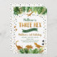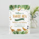 Cette adorable invitation à l'anniversaire présente des feuilles d'aquarelle tropicale ornés d'ornements en feuille d'or et de silhouettes de dinosaures dorées.