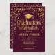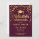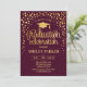 Invitation à la fête de fin d'études pour hommes ou femmes. Elégante carte invitation en marron bordeaux et or. Design simple et moderne avec des confettis de parties scintillant, un casquette et des scripts de typographie. Idéal pour une célébration élégante de remise des diplômes.