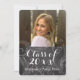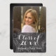 Des torsades recouvrent délicatement le bord de votre photo, beau tableau en ardoise gris élégant avec des éléments tourbillonnant spécialement pour la finition senior. Belle gracieuse grise et blanche à l'apparence manuscrite tourbillons et script, imprimé sur mesure pour votre diplômé. Rappelle le tableau de classe avec une touche de classe et de style élégant.