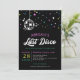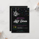 Invitation à la soirée disco sur le thème de la bachelorette en noir avec étoiles et fusées lumineuses de couleur néon. La dernière discothèque de la bachelorette aux couleurs néons et blanc et noir.