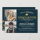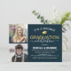 Double la fête, double le plaisir ! Une élégante invitation à la graduation conjointe avec un arrière - plan bleu marine élégant qui peut être changée en n'importe quelle couleur, des photos de style carré au lieu des photos des deux diplômés, une casquette faux or de graduation et un modèle moderne à double célébration facile à personnaliser. Au verso se trouve une diffusion de la parties scintillant de confetti en or du parti.