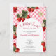 Cette mignonne invitation de fête de bébé "Douce Baie" rouge, rose et verte à thème de fraise avec texte personnalisable est parfaite pour une fête de bébé fille. Elle présente des motifs de fraise rouges et verts sur un fond à carreaux et un texte que vous pouvez personnaliser avec vos propres détails. Le modèle d'invitation est personnalisable dans l'éditeur de liste et est également disponible en téléchargement numérique imprimable après personnalisation.