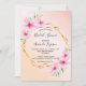 Une élégante invitation à la nuptiale tropicale estivale. Avec un cadre géométrique en faux or décoré d'hibiscus rose pâle, fleurissent des fleurs tropicales avec un peu de verdure. Un arrière - plan rose or et rose vif dégradé. Le nom de la mariée à être est écrit avec un script de style manuel moderne. Texte noir. Dos : Un arrière - plan rose doré et rose pâle.