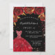 Une invitation moderne, élégante et glamour pour une fête Sweet 16, 16e anniversaire. Un arrière - plan noir avec des faux étincelles rouges, une robe et des roses rouges, des fleurs. Le nom est écrit avec un script de style moderne écrit à la main. Personnalisez et ajoutez les détails de votre fête.