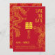 Une carte unique pour annoncer la date de l'événement, avec un dragon et un phénix de style en or sur fond rouge.