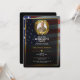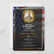 Photo personnelle décorée de feuilles de laurier dorées et d'un cadre doré sur un drapeau américain glorieux flottant sur un fond noir. Un modèle d'invitation de fête de retraite élégant avec photo facile à éditer. Ce design luxueux convient aux vétérans, aux militaires, aux emplois liés au gouvernement, à la police ou aux emplois liés au patriotisme.