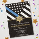 Ce design présente un drapeau de la force de police avec des bandes noires et blanches, et une fine bande bleue également. Le badge de police et le texte doré se trouvent au-dessus de tous les détails de la fête pour les détails de la fête de retraite de l'agent de la force de l'ordre, du shérif, du capitaine ou du chef à la retraite.
