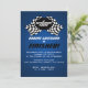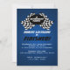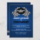 Fini, fini, retraité ! Célébrez la retraite avec ce plaisir à damiers drapeaux invitation thème course en bleu.