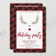 Conception élégante et tendance d'invitation pour une fête de vacances d'entreprise avec un renne gai et drôle sur un motif à carreaux de buffle et de houx.