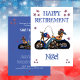Fête de la retraite amusante Invitation pour le retraité. Célébrez la retraite d'un membre de la famille, d'un ami ou d'un collègue avec cette Drôle Retraite Invitation conçue avec un vieux motard caricature. Le texte de la première page comprend : Joyeux Retraite et le prénom en bleu sur un arrière - plan blanc aux étoiles colorées. Le texte inverse comprend : le nom, la date, l'heure, l'emplacement, l'adresse et la note RSVP sur un arrière - plan bleu. Pour personnaliser, il vous suffit d'insérer vos détails dans notre modèle facile à l'aide de notre guide pas à pas et des outils à l'écran. C'est rapide et facile à faire. Bon appétit !