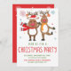 Carton d'invitation drôle pour une soirée de Noël avec des rennes sur une carte mignonne. Cette invitation recto-verso est conçue avec une paire de rennes de Noël amusants habillés pour une fête dans des couleurs de Noël vives. Le texte du recto comprend : Rejoignez-nous pour une soirée de Noël, la date, l'heure, le nom de votre famille et votre adresse. Le texte au verso comprend : les détails de votre RSVP sur un fond rouge vif avec des flocons de neige blancs et des accents. Pour personnaliser cette invitation pour une soirée de Noël, il suffit d'insérer votre texte dans notre modèle facile, en remplaçant l'exemple. C'est rapide et facile !