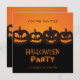 Invitation bidirectionnelle. Le devant montre quatre citrouilles sculptés sur une rangée et "Halloween Party" en grunge police ci-dessous. L'invitation et le texte de date sont personnalisables. L'arrière - plan est orange et les autres éléments sont noirs. Le verso affiche le texte citrouille et personnalisable avec l'adresse et les coordonnées. Drôle, cool et éffrayant. Un produit dans une suite de fête.