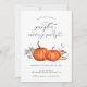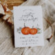 Carte d'invitation halloween amusante à thème fête avec aquarelle illustration de citrouilles avec verdure. Le texte dit "veuillez vous joindre à nous pour une fête de sculpture citrouille."