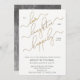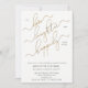 Ce magnifique et moderne Black White and Gold Script Rehearsal Dinner Invitation présente un faux script de calligraphie de feuille d'or lisant "To Love, Laughty, and Happily Ever After" comme élément principal du design. Le design est magnifiquement complété par la police sans serif tout casquette moderne en noir, sur l'arrière - plan blanc et croustillant, détaillant l'heure, la date et l'emplacement du dîner de répétition. L'arrière de l'invitation de mariage présente une aquarelle en noir et blanc au verso, pour compléter le look chic et sophistiqué. Copyright Anastasia Surridge, tous droits réservés.