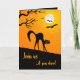 Carte d'invitation de la fête d'Halloween avec l'illustration d'un chat noir maléfique au visage jack-o-lanterne, chauves-souris volantes et pleine lune, sur noir et orange. Cliquez sur "customisez-le" pour le personnaliser avec votre propre texte personnalisé. Des timbres correspondants sont également disponibles.