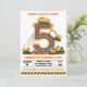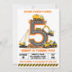 This cute construction truck 5th birthday invitation features bright yellow dump trucks, excavators, cranes, and cement mixers forming a bold road-style number five— perfect for a construction-themed boy birthday party.