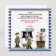Pirate anniversaire de enfant invitation de la fête qui comprend un bateau pirate avec Crull et Cross Bones Pirate Drapeau, un coffre au trésor de pirate et quelques petits pirates mignons, l'un avec un crochet et un perroquet sur son bras, l'autre avec une carte au trésor et une épée et tous avec des écailles de oeil. Il y a une bordure rayée avec des rayures bleues et blanches. Un design adorable, parfait pour n'importe quel enfant, qui a choisi un thème pirate pour sa fête. Noir, marron, rouge, blanc, vert, bleu, beige.