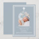 Arrière - plan bleu Dusty, décoré d'un cadre blanc, et d'une croix blanche Personnalisez et ajoutez un nom photo et des détails. Texte blanc. Cadre photo en forme d'arc.