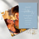 Cette élégante invitation de mariage peut être personnalisée avec vos détails de célébration mis en typographie chic sur un arrière - plan bleu poussiéreux et votre photo spéciale au verso. Conçu par Thisisnotme©