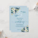 Une élégante invitation de mariage avec des fleurs de parties scintillant bleu et or poussiéreux et une calligraphie élégante que vous pouvez customiser avec vos détails.