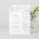 Carte de faire-part de mariage bleue poussiéreuse budget avec d'élégantes fleurs à main botanique dessinées pour un mariage moderne élégant. Belle ligne imprimée à la main sur arrière - plan blanc, sur la conception tendance avec texte de script. Initiales et bouquet à l'arrière.