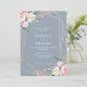Faire-part de mariage personnalisable en bleu poussiéreux. Joli bouquet floral dans les tons rose vif et rose poussiéreux, avec un cadre géométrique doré moderne.