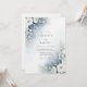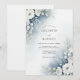 This design features a delicate wash of dusty blue watercolor artfully blended with an array of white blooms and soft green foliage. A romantic and ethereal mood is evoked, perfect for a serene union. The painterly style creates a dreamy, sophisticated aesthetic.