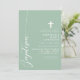 Célébrez l'occasion sacrée d'un baptême avec cette élégante invitation verte à la menthe poussiéreuse. Avec son design minimaliste, son écriture moderne et sa croix délicate, cette invitation est parfaite pour inviter amis et famille à participer à cet événement spécial. La couleur douce et les lignes simples et propres ajoutent une touche de sophistication et de grâce, ce qui en fait l'idéal pour une célébration si significative. Customisez les détails pour créer une invitation unique et mémorable pour le baptême de votre enfant.