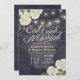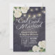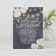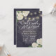 EAT Drink and Be Married Mariage Celebration / Bridal Shower Invitation Cartes Modèles - Elégante White Hydrangea Flowers and String Lights sur Vintage Marine Blue Floral Linen Arrière - plan. Un design parfait pour votre grand jour. Tous les styles de texte, couleurs, tailles peuvent être modifiés selon vos besoins !
