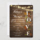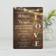 Echelle en bois vintage aux lettres LOVE décorée de feuilles en chêne d'automne aux couleurs chaudes de l'automne sur cette suite rustique de faire-part de mariage. Les lampes à cordes scintillantes Sparkley ajoutent un charme supplémentaire à l'arrière - plan en bois de grange foncé.