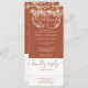 Une faire-part de mariage tout-en-un avec de jolies lampes à cordes et une typographie élégante sur un arrière - plan en terre cuite. L'invitation comprend une carte RSVP qui peut être coupée et des informations sur les invités. Conçu par Thisisnotme©
