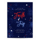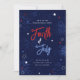Fêtez l'anniversaire de l'Amérique avec cette invitation amusante et patriotique 4 juillet jardin barbecue avec feu d'artifice et étoiles sur un arrière - plan bleu foncé avec typographie rouge blanc et bleu.