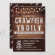Ce design marron rustique est orné d'un arrière - plan rustique en bois avec des lampes à cordes et des graphiques en écrevisses. Cette invitation est excellente pour les diplômes, mais le texte peut aussi être customisé pour les anniversaires, les mariages, les réunions de famille, et toute autre partie où vous pouvez avoir une langouste, écrevisse, crabe, ou homard ébullition à. Profitez de votre langouste et de fruits de mer bouillir!