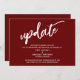 La distinction de cette suite est due à la police de script manuscrite moderne utilisée pour les phrases d'accent. Si vous devez informer vos invités que votre mariage a été annulé, cette carte vous offre une option audacieuse et attrayante. Dans cet article, la police de caractères manuscrite a été utilisée pour créer un graphique simple représentant le mot "update". Utilisez les champs modèles pour ajouter vos détails personnels et faire de ce design unique et moderne votre propre. L'arrière - plan solide peut être changé à n'importe quelle couleur que vous préférez. Veuillez communiquer avec toute demande spéciale ou customiser de l'aide. // 100 //