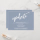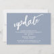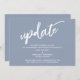 La distinction de cette suite est due à la police de caractères moderne et manuscrite utilisée pour les phrases d'accentuation. Dans le cas où vous auriez besoin de faire savoir à vos invités que votre mariage a été annulé, cette carte propose une option audacieuse et accrocheuse. Dans ce modèle, la police de caractères manuscrite a été utilisée pour créer un graphique simple représentant le mot "mise à jour". Utilisez les champs du modèle pour ajouter vos informations personnelles et rendre ce design moderne et unique vôtre. Le fond uni peut être modifié à la couleur de votre choix. N'hésitez pas à nous contacter pour toute demande spéciale ou pour une aide à la personnalisation. // 100 //