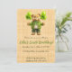 This sweet, editable birthday invitation features an illustration of a bear with a green bow tie holding six balloons against a beige linen background. The details of the event are below. On the back is a field for additional information. The text on both sides is editable so go ahead and change the details as well as the font style, size and colour. This versatile invitation can be used for any children's birthday milestone, baby showers etc.