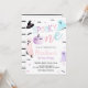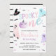 Une fête d'halloween pas éffrayante ! Pastel rose, violet et orange Éffrayant One Ghost Halloween 1er anniversaire invitation avec arrière - plan rayé noir et blanc.