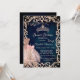 A modern, chic and glamorous invitation with an elegant gold tiara, dress, Eiffel Tower, and glitter butterflies on a blue background.