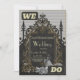Elégance en argent et noir. Cette image présente une illustration en noir et blanc d'un cadre mariage aux motifs en or et en argent complexes. Le cadre est orné de motifs floraux ornés et d'une arcade centrale. Une mariée en robe flottante, tenant un bouquet, se tient dans le cadre, face à l'extérieur du spectateur. L'arrière - plan est une surface noire texturée, créant une atmosphère dramatique et élégante.