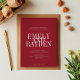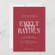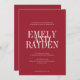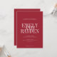 La faire-part de mariage est minimaliste et présente un arrière - plan rouge rubis et un agencement propre et symétrique. Il utilise d'élégantes polices serif, avec les noms du couple clairement affichés dans un grand texte qui se chevauchent pour une touche audacieuse et moderne. Les autres détails sont disposés dans une police plus petite et claire, tout en conservant simplicité et sophistication, mêlant esthétique contemporaine et traditionnelle.