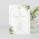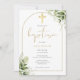 Doté de feuilles de verdure d'aquarelle délicate et d'une élégante arche dorée et crucifix, cette invitation chic au baptême neutre pour les hommes peut être personnalisée avec vos informations spéciales et votre photo au verso. Conçu par Thisisnotme©